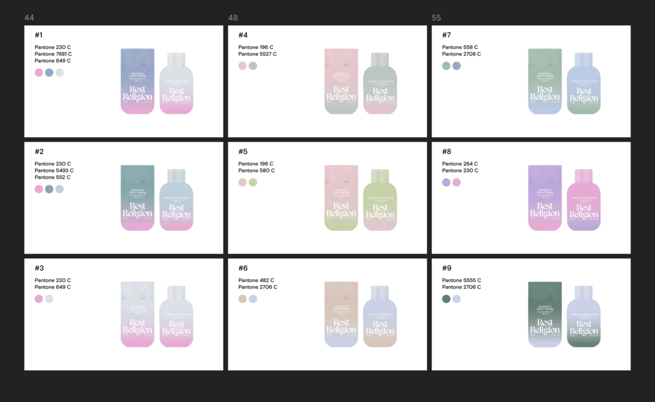 At Rest Religion, we built everything around the “Holy Halo” metaphor—a gradient that radiates from the product to your skin. The color palette is soothing and calming, with muted tones of purple and pink, creating a serene yet striking look that sets it apart from typical minimalist packaging.