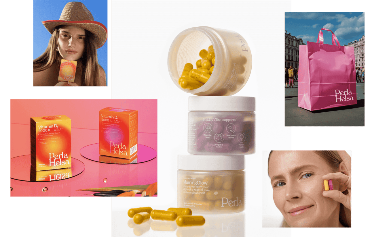 Perla Helsa’s visual identity blends emotional elegance with clinical clarity. At the center is the transformative shell — reimagined across lines. In the main supplement range, it appears geometric and structured; in the beauty line, it shifts into a soft, fluid form, blurred like it’s seen through water.